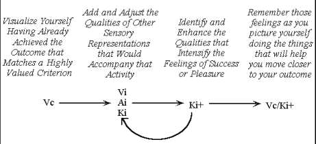 The following strategy demonstrates how the various elements of imagination, expectation, criteria, submodalities and association can be combined into a simple strategy to help people better inspire and motivate themselves to take actions which will lead them to desired outcomes.